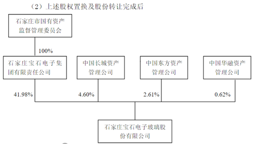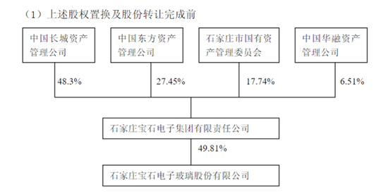 彼时宝石集团最大的股东是中国长城资产管理公司(股权占比48.3),另外三大股东分别为中国东方资产管理公司(占股27.45%)、石家庄国资委(占股17.74%)、中国华融资产管理公司(6.51%)。