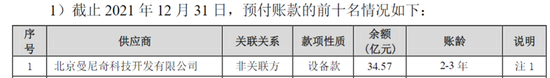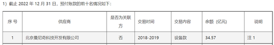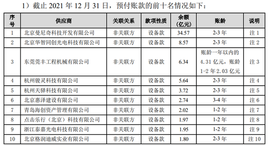 不过从东旭光电回复深交所的年报问询函中可知,截止2021年末,其对曼尼奇科技的预付款余额就达到34.57亿元,当时账龄已有2~3年。