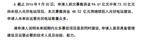 或许是觉得从股市“圈钱”太容易,紧接着2016年10月,东旭蓝天又对外公布48.5亿元的定增预案,称募资是为“建设光伏电站”。