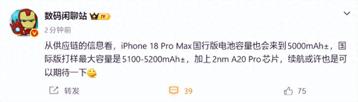 国际版的iPhone18ProMax,由于搭载eSIM技术,所以电池容量来到了5200mAh。
