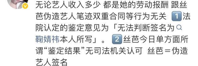 更戏剧的是,亿元收入争议背后,藏着“20年长约”罗生门。丝芭称2018年签补充协议将合约延至2033年,要绑定鞠婧祎至40岁,却被鞠婧祎方晒出法院两次司法鉴定结果——均“无法判断签名为本人所写”,反观丝芭自找机构出具的“真实签名”报告,被网友吐槽“自说自话”,2024年丝芭主动谈续约的操作,更坐实原合约已到期的事实。