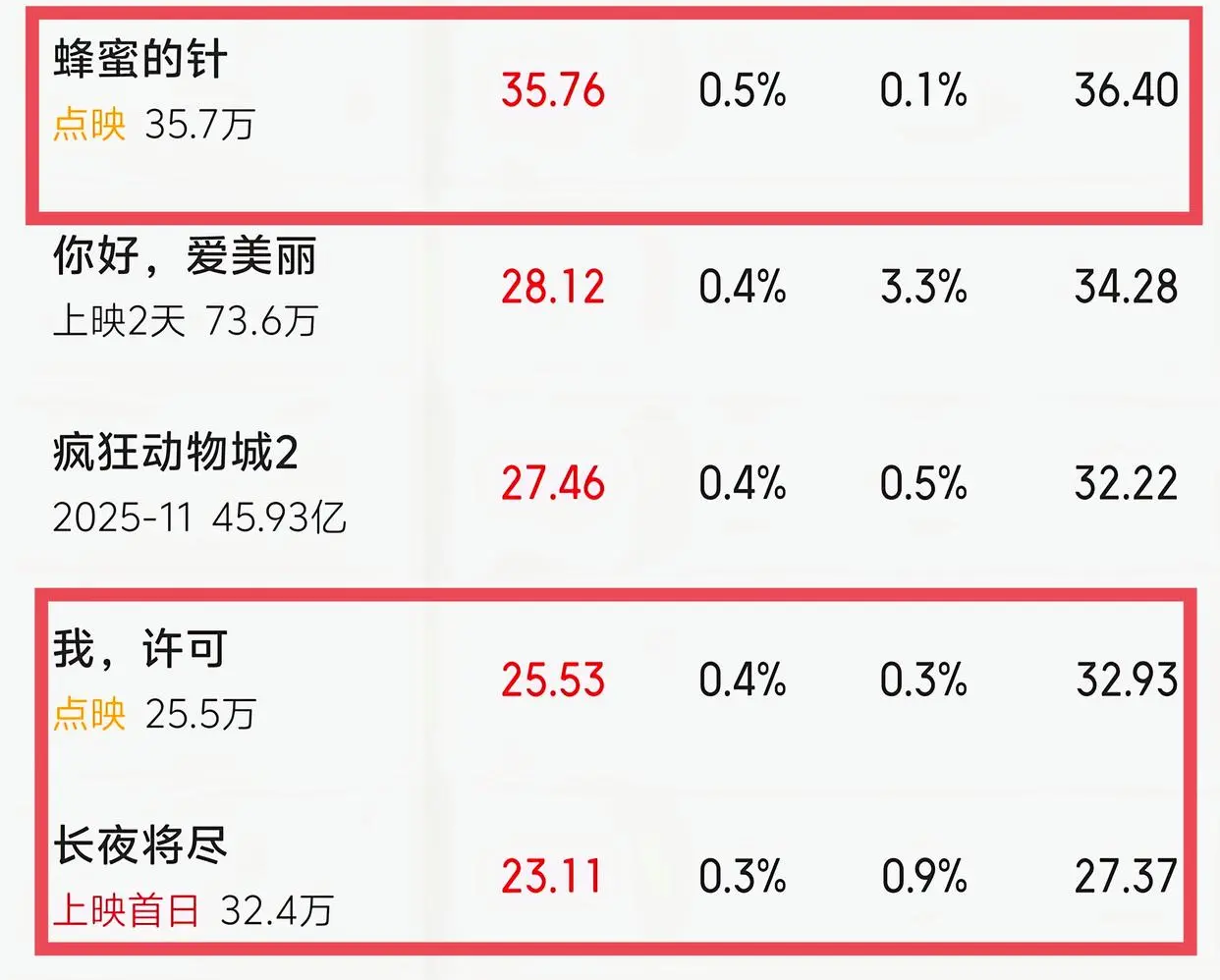 《蜜蜂的针》是这三部新片里,排片最低的,只有0.1%,但其票房数据却是最好的一部,才点映了一天就拿到35.7万。